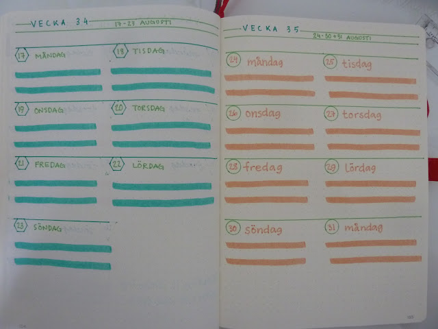 Jag visste såklart redan att mina veckouppslag med en vecka på två sidor var något av ett slöseri på sidor. Så i augusti (lagom tills det händer mer grejer) bestämde jag mig för att ge varje vecka en sida istället. Det kan ju bli färgglatt och roligt ändå, som synes. Jag är inte helt klar med de sista två veckorna, men ville passa på att visa hur jag gör när månaden slutar med bara någon dag in på en ny vecka - jag skriver helt enkelt in den i sista veckan. Fler än två dagar brukar dock bli att jag gör ett överlappande veckouppslag.