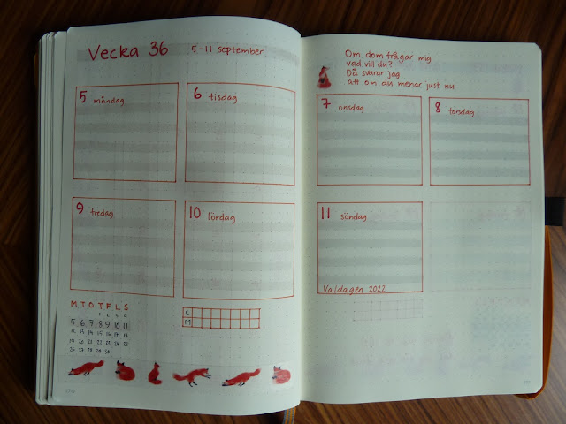 Jag hade bestämt mig för att september skulle få rävtema. Nu har ju jag mer än en washi med rävmotiv, så jag bad Chilipojken välja bland dem. Han tvekade inte en sekund ens när han valde den här med en ganska så röd räv som gör sker som rävar gör. Just den här washitejpen är köpt från Etsy, men jag minns inte vilken butik.